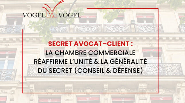 actualités articles fermer #LECONSEILDUMOIS DÉCISIONS DÉCRYPTAGE DISTINCTIONS PUBLICATIONS Toutes les rubriques Rubriques Toutes les rubriques #LECONSEILDUMOIS DÉCISIONS DÉCRYPTAGE DISTINCTIONS PUBLICATIONS Posté le 29/10/2025Rubriques DÉCRYPTAGE Secret avocat–client : la Chambre commerciale réaffirme l’unité .. La Chambre commerciale de la Cour de cassation vient de rendre un arrêt de principe (Com., 8 octobre 2025, n° 24- 16.995, publié au Bulletin) qui repose la question du périmètre de la confidentialité avocat-client. Cet arrêt a été rendu en matière fiscale mais peut exercer une influence sur d’autres domaines du droit. Autant il… Lire Posté le 24/09/2025Rubriques DÉCRYPTAGE Atelier Vogel & Vogel x AFJE • Réforme du régime de la respon.. Atelier animé par Me Charles-Siegfried Fahrner et Me Sylvain Corvol, experts du cabinet Vogel &… Lire Posté le 23/09/2025Rubriques DÉCRYPTAGE Pourquoi les limitations drastiques à la confidentialité avocat-clie.. La Chambre criminelle maintient une lecture très restrictive de la confidentialité avocat-client, limitée aux correspondances… Lire Posté le 28/08/2025Rubriques DÉCRYPTAGE Le secret professionnel de l’avocat et son opposabilité aux autorit.. Maître Joseph Vogel décortique, dans l'émission LEX INSIDE - BSMART 4CHANGE animée par Arnaud Dumourier,… Lire Posté le 31/07/2025Rubriques DÉCRYPTAGE Rapport annuel 2024 de l’Autorité de la concurrence : même si l’.. Le 10 juillet, l’Autorité de la concurrence a rendu public son rapport annuel, dont la… Lire tous les articles Comment anticiper l’augmentation des amendes pour retards de paiement, pouvant passer à 1% du chiffre d’affaires mondial de l’entreprise ? Posté le 22/07/2025Rubriques DÉCRYPTAGE Lire La Chambre criminelle maintient sa vision très restrictive des droits de la défense dans le cadre des enquêtes de concurrence Posté le 17/07/2025Rubriques DÉCRYPTAGE Lire Démantèlement de Casino : Auchan consolide ses positions Posté le 17/07/2025Rubriques DÉCRYPTAGE Lire Les risques des prises de participations minoritaires entre concurrents Posté le 25/06/2025Rubriques DÉCRYPTAGE Lire Charger plus
