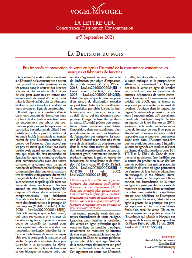 Ce mois-ci, nous attirons votre attention sur les décisions de la Cour de cassation sur le délai de prescription en matière de garantie des vices cachés (La décision du mois), ainsi que sur l’actualité en matière de contrôle des concentrations (Notre Conseil du mois).